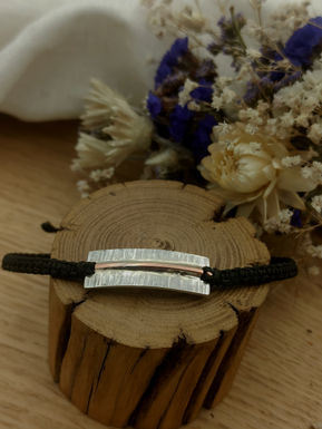 Bracelet en argent (925 millièmes) et en cuivre // Motif rectangle en argent surmonté d'un fil en cuivre // Longueur de la plaque : ~3cm La plaque est montée sur un cordon tressé, ajustable au poignet.